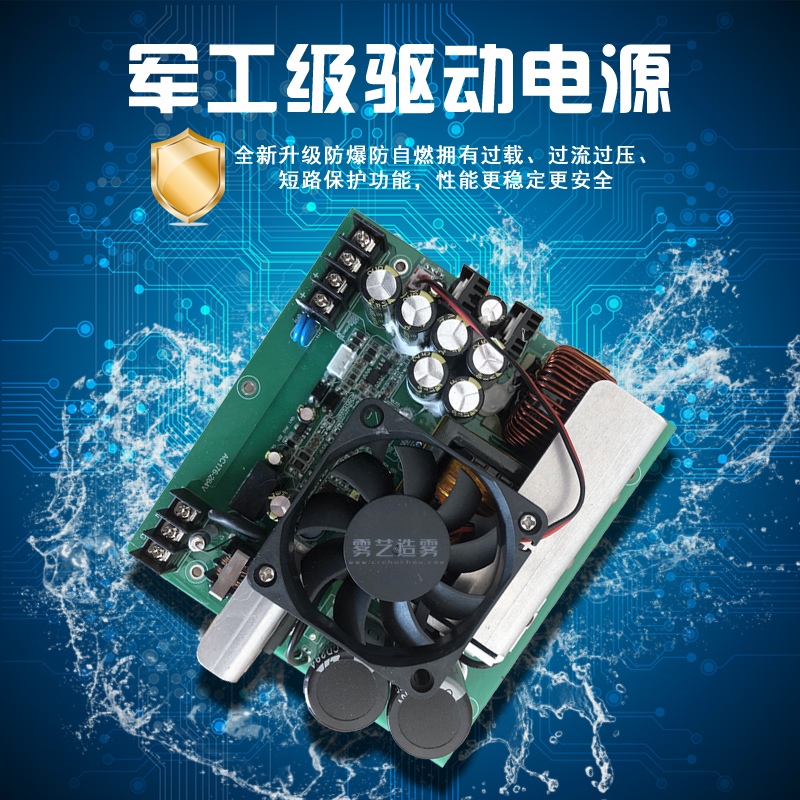通过超声震荡原理作用于水产生空化效应,将水变成可漂浮于空气中的极细小的微雾(水雾颗粒直径在5um之内)与空气充分混合从而达到加湿的目的。水雾中含大量空气负离子及水分子,增加空气湿度的同时更能够清新空气,是目前国内外应用较为广泛的一种加湿方式