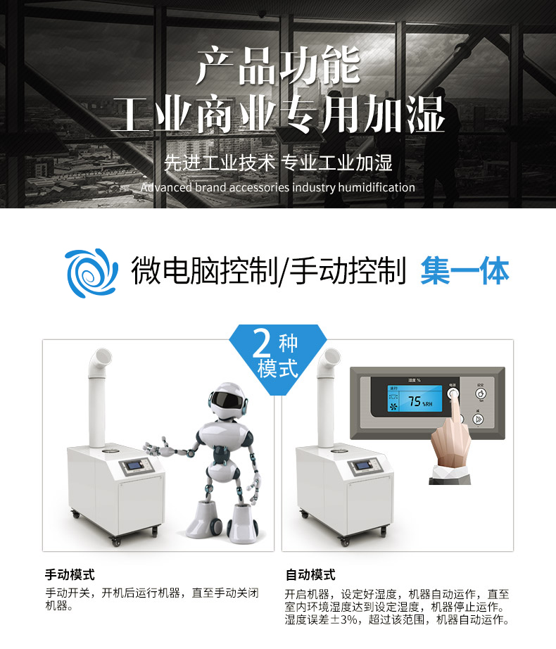 3, 湿度自动控制,即设定好需要的空间湿度值,当机器工作一段时间后达到设定湿度值时,机器自动停机,当空间湿度降低时,机器随即自行启动工作,也可以设置为手动控制。
